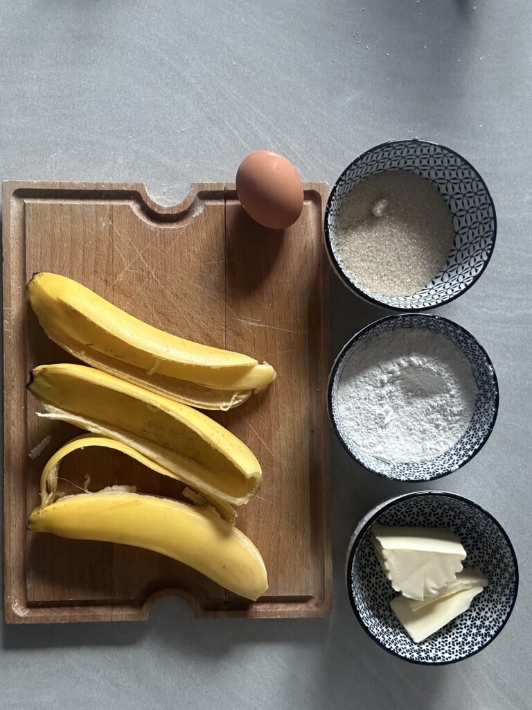 Ingrédients : 3 bananes bio (les peaux uniquement, bien lavées et Bio de préférence, pour les peaux surtout. Parce que si on va chercher la valeur dans ce que d’autres jettent, autant s’assurer que ce trésor-là est irréprochable.)- 85 g de beurre – 80 g de farine – 50 g de cassonade – 1 oeuf- 1 cuillère à café de levure chimique